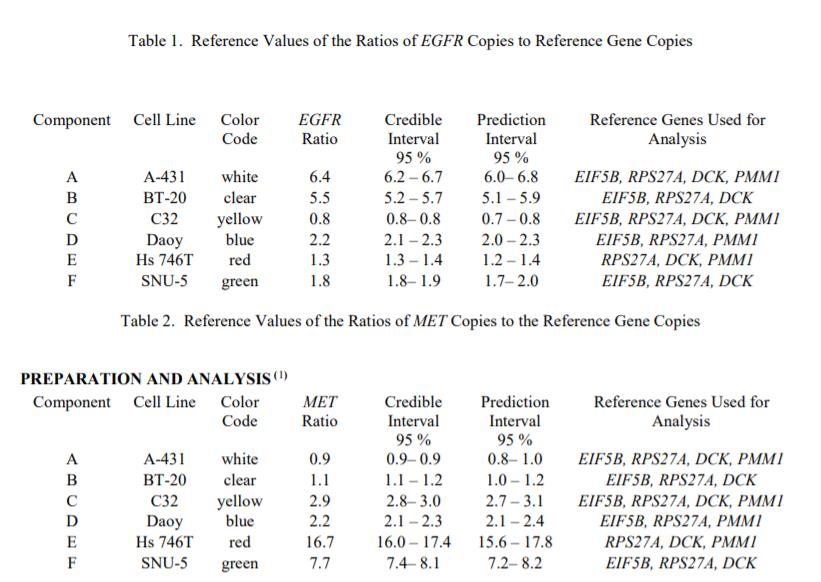 在 260 nm 處通過吸光度測量確定的組分 A、B、C、D、E 和 F 的濃度分別為 21.6 μg/mL、21.7 μg/mL、21.5 μg/mL、22.9 μg/mL、23.1 μg/mL 和 21.0微克/毫升,分別。在準(zhǔn)備稀釋液時,重要的是要考慮各個組分中 EGFR 和 MET 的擴(kuò)增水平,以確保 EGFR 和 MET 拷貝數(shù)在您正在使用的檢測的工作范圍內(nèi)。一個單位的 RM 由每個組分的一個小瓶組成,其中包含大約 100 μL 的 DNA 溶液。這些小瓶中的每一個都貼有標(biāo)簽,并且用顏色編碼的螺帽密封。