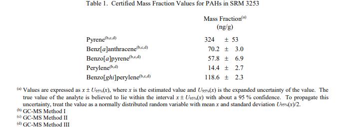 表 1 提供了以干質(zhì)量為基礎報告的選定 PAH 的認證質(zhì)量分數(shù)值。NIST 認證值是 NIST 對其準確度具有最高置信度的值,在所有已知或懷疑的偏差的來源已被調(diào)查或考慮 [1]。 NIST 進行了賦值分析;認證值計算為 NIST 方法平均值的未加權(quán)平均值。相關的不確定性以大約 95% 的置信水平表示 [2-4]。