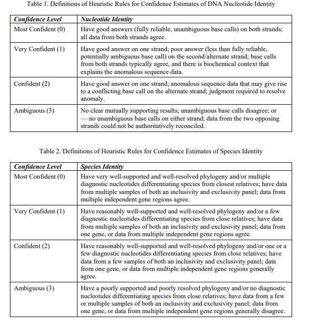 NIST SRM 3246銀杏葉(葉子)經(jīng)認(rèn)證的物種鑒定是銀杏,來自 psbA-trnH 基因間間隔區(qū)和 trnL 內(nèi)含子區(qū)域的相關(guān)葉綠體 DNA 序列可在伴隨的 FASTA 格式文件中獲得 [1]。與序列中每個核苷酸相關(guān)的不確定性,以及與作為物種標(biāo)識符的 DNA 序列相關(guān)的不確定性,以表示對規(guī)定值的信念強(qiáng)度的序數(shù)尺度表示(0 = 最有信心,1 = 非常有信心,2 = 有信心,3 = 模棱兩可)(表 1 和表 2)[2]。