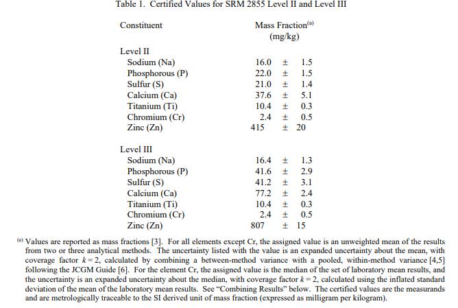表 1 報(bào)告了 SRM 2855 II 級(jí)和 III 級(jí)成分的認(rèn)證值。賦值類(lèi)別基于 NIST 用于化學(xué)參考材料的術(shù)語(yǔ)和模式的定義 [1]。 NIST 認(rèn)證值是 NIST 對(duì)其準(zhǔn)確性有最高置信度的值,因?yàn)樗幸阎蚩梢傻钠顏?lái)源都已被調(diào)查或考慮在內(nèi)。認(rèn)證值根據(jù) NIST 和合作實(shí)驗(yàn)室使用儀器測(cè)試方法進(jìn)行的分析結(jié)果,提供對(duì)真實(shí)值的最佳估計(jì)。