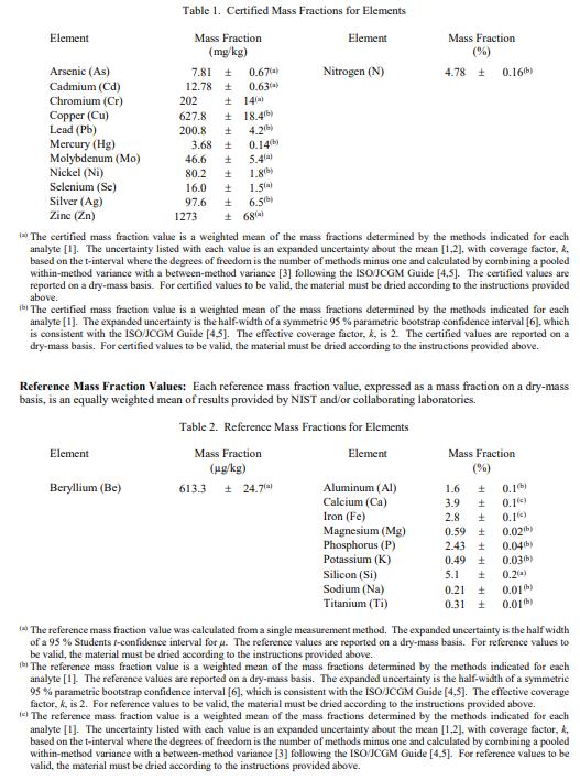 表 2 至表 5 中提供了元素和有機(jī)成分的參考質(zhì)量分?jǐn)?shù)值;表 7 末尾提供了分析方法。參考值是未經(jīng)認(rèn)證的值,是基于可用數(shù)據(jù)對(duì)真實(shí)值的最佳估計(jì)。這些值不符合 NIST認(rèn)證標(biāo)準(zhǔn)并提供相關(guān)的不確定性,這些不確定性可能僅反映測(cè)量再現(xiàn)性,可能不包括所有不確定性來(lái)源,或者可能反映多種分析方法之間缺乏足夠的統(tǒng)計(jì)一致性 [1]。被測(cè)量是表 2 至表 5 中列出的質(zhì)量分?jǐn)?shù),由規(guī)定的方法確定,并且在計(jì)量上可追溯到 SI 單位,以百分比或微克/千克表示的質(zhì)量分?jǐn)?shù),如表中所示。