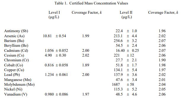表 1 列出了 SRM 2668 的 I 級 6 種元素和 II 級 14 種元素的認(rèn)證質(zhì)量濃度值。 NIST 認(rèn)證值是 NIST 對其準(zhǔn)確性有最高信心的值已知或可疑的偏見來源已被調(diào)查或考慮帳戶 [1]。數(shù)值來自 NIST 和合作實(shí)驗(yàn)室提供的結(jié)果的組合。